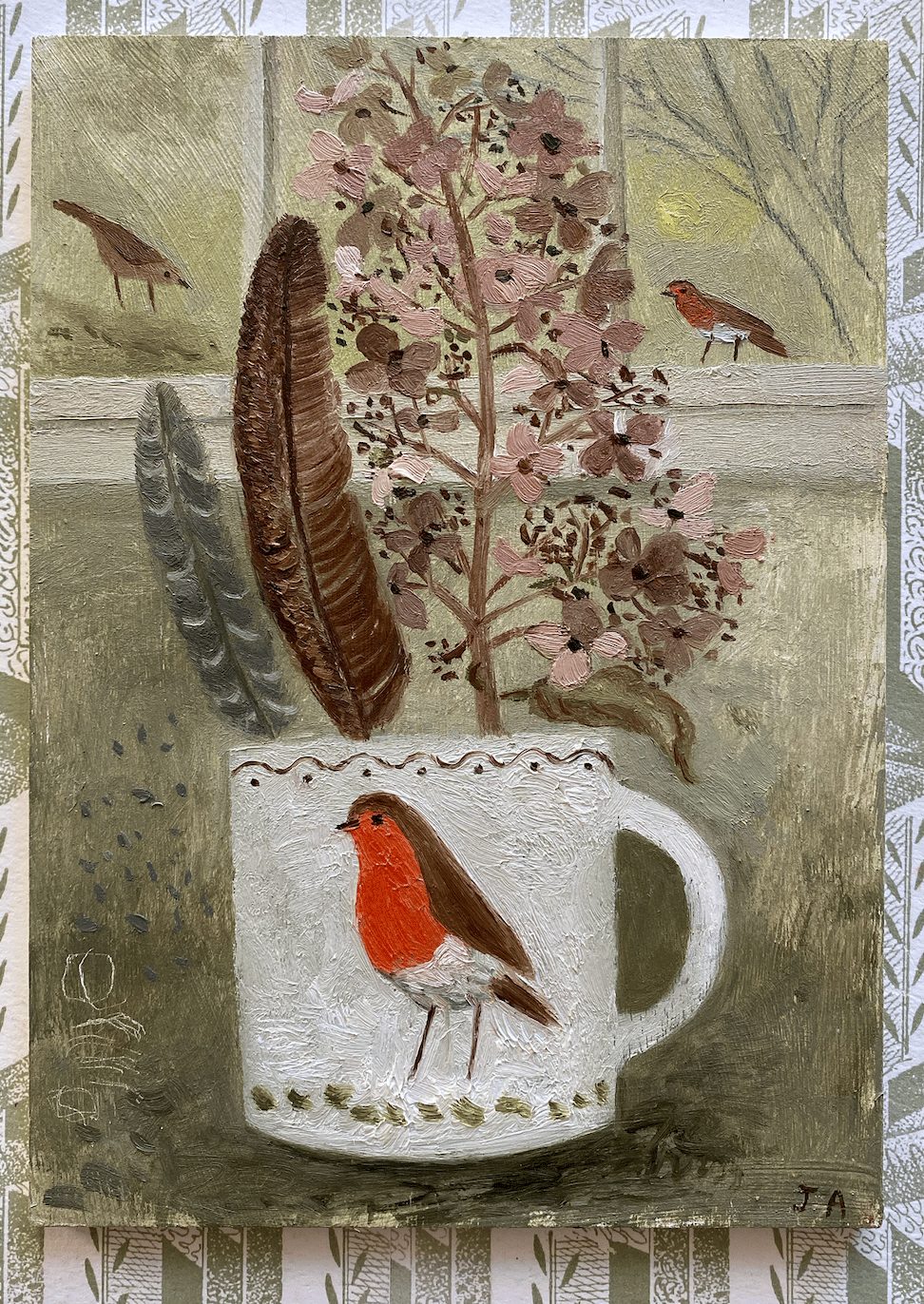Bird Garden an oil painting on board by Jo Aylward Size: 17.5 x 12.5 cm Shipping: Special delivery in the Uk, tracked everywhere else.