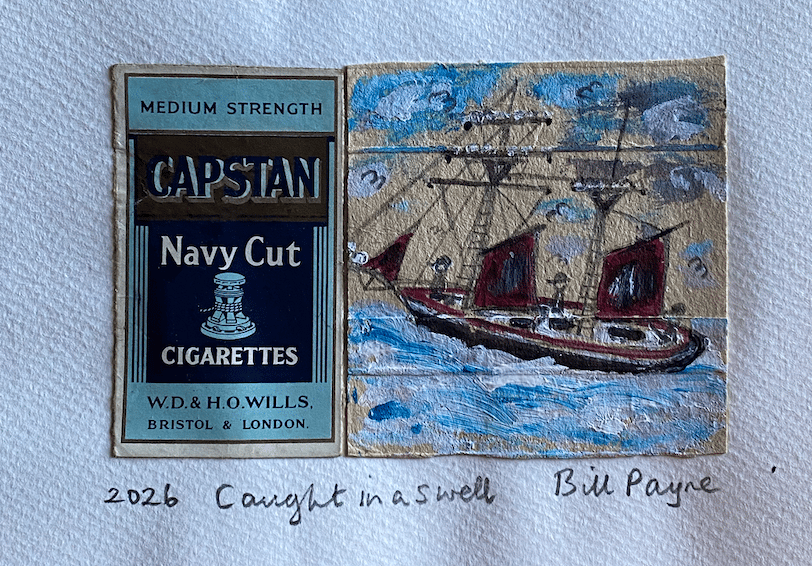 Caught in a swell by Bill Payne, a mixed media painting on a vintage cigarette packet, mounted onto watercolour paper. Bill"s paintings are inspired by the artist Alfred Wallis.