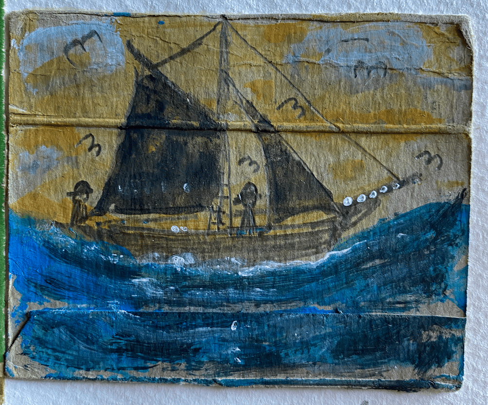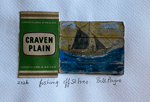 Fishing off St Ives by Bill Payne, a mixed media painting on a vintage cigarette packet, mounted onto watercolour paper. Bill"s paintings are inspired by the artist Alfred Wallis.