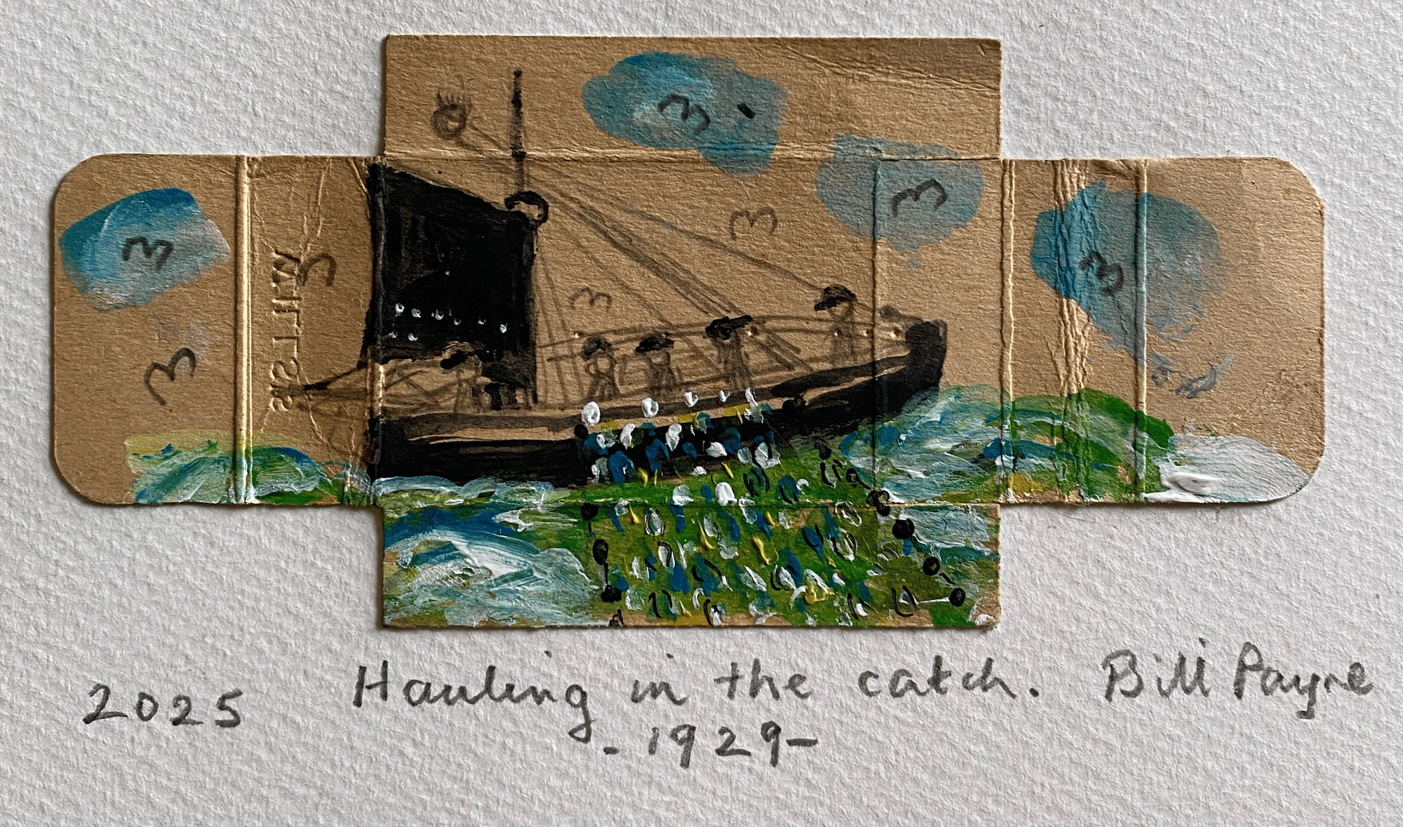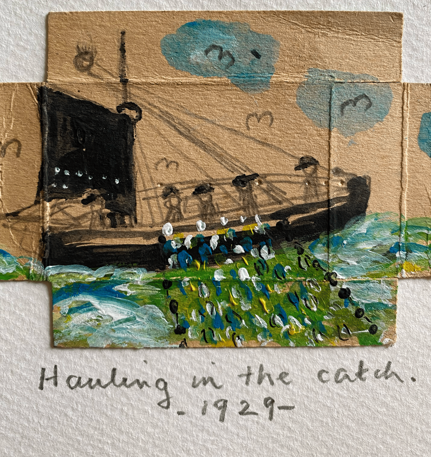 A mixed media painting inspired by Alfred Wallis painted by the artist Bill Payne. A painting on a vintage cigarette packet and mounted on watercolour paper.