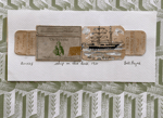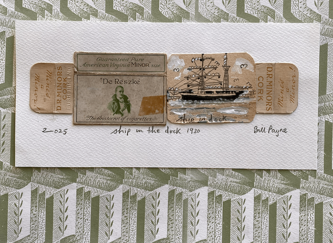 A mixed media painting inspired by Alfred Wallis painting by Bill Payne. A painting on a vintage cigarette packet and mounted on watercolour paper.